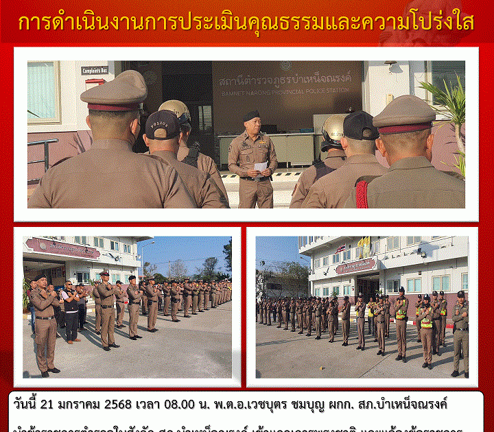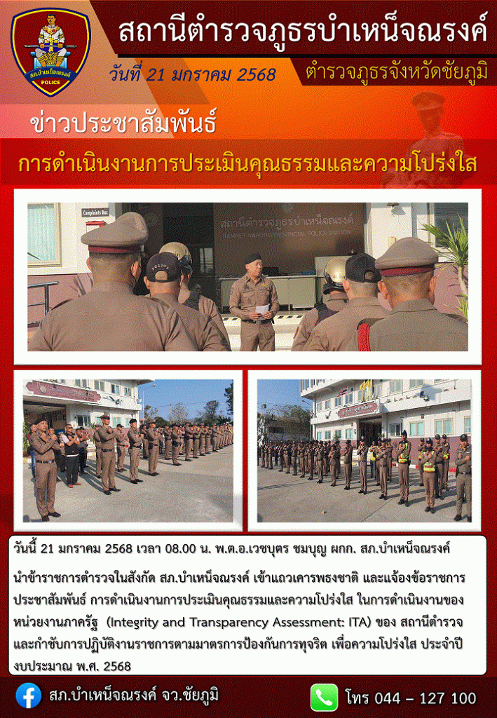 เมื่อวันที่ 8 ตุลาคม 2567 เวลา 10 .00 น. พ.ต.อ.เวชบุตร ชุมบุญ ผกก.สภ.บำเหน็จณรงค์. ได้ประชุมกำชับการปฏิบัติหน้าที่ของข้าราชการตำรวจ เพื่อป้องกัน และต่อต้านการทุจริต / ต่อต้านการรับสินบน ให้ผลการปฏิบัตสอดคล้องกับการดำนินการประเมินคุณธรรมและความโปร่งใสในการดำเนินงานของหน่วยงานภาครัฐ(Police Integrity and Transparency Assessment: ITA) ของสถานีตำรวจ ปีงบประมาณ 2568 ณ ห้องประชุมชั้น 3 สภ.บำเหน็จณรงค์