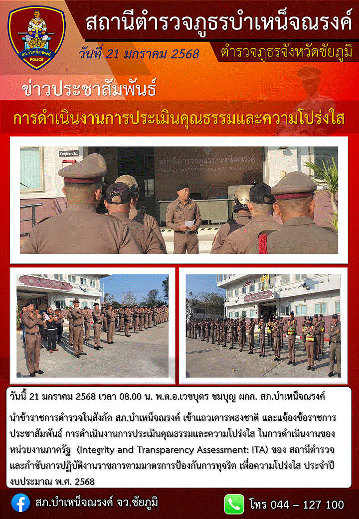 วันนี้(27 มี.ค.68) เวลา 13.30 น. พ.ต.อ.เวชบุตร ชมบุญ ผกก.สภ.บำเหน็จณรงค์ พร้อม จนท.รับผิดชอบงาน ITA