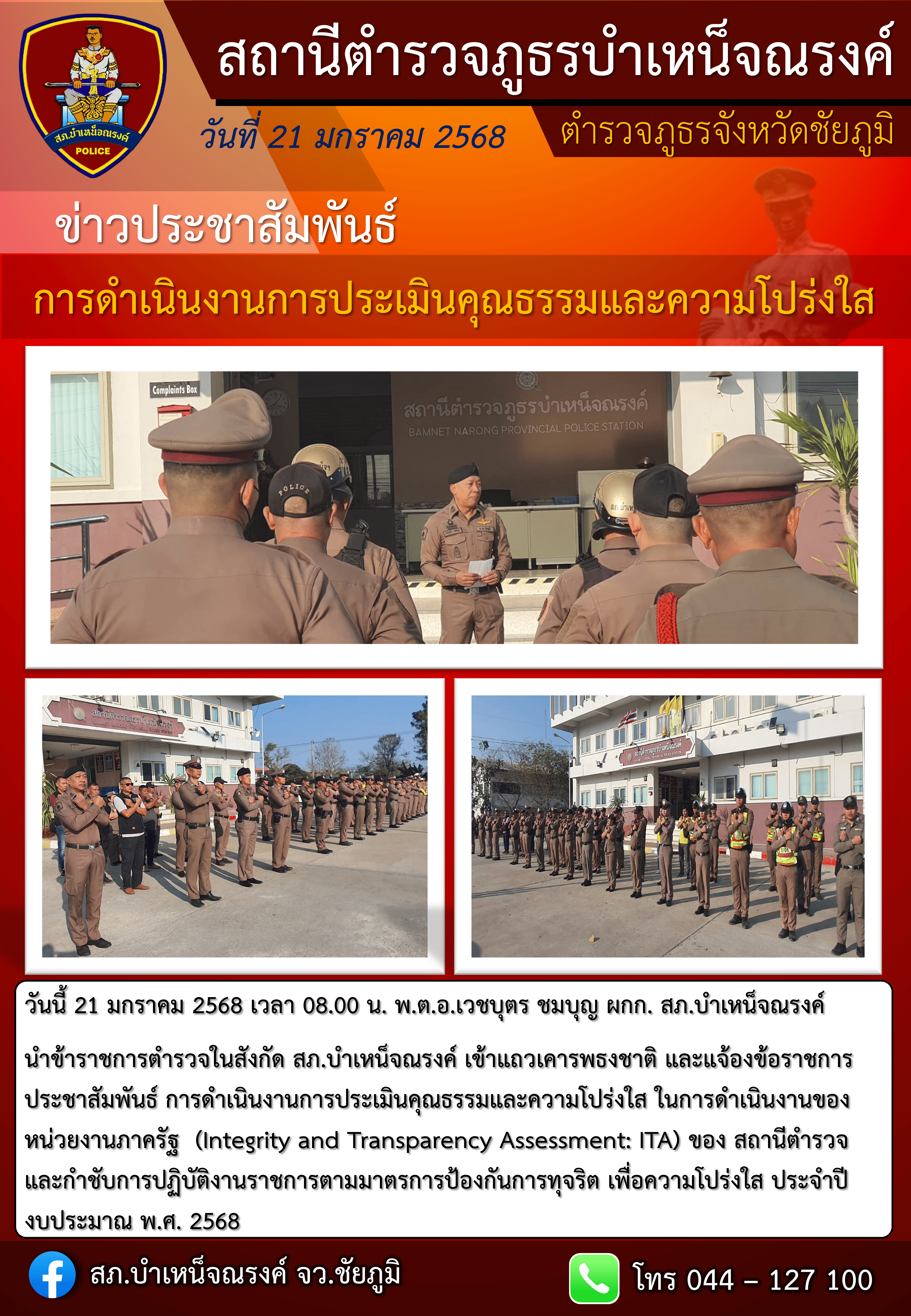 วันนี้ 21 มกราคม 2568 เวลา 08.00 น. พ.ต.อ.เวชบุตร ชมบุญ ผกก. สภ.บำเหน็จณรงค์ นำข้าราชการตำรวจในสังกั